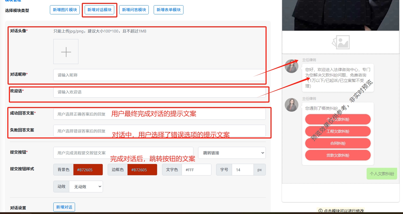 点击【新增对话模块】,用户跳转前先让用户回答线索相关的问题,过滤无效的线索,提升广告质量