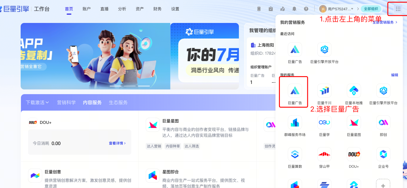 进入巨量广告模块,如果没有巨量广告账户,直接申请一个即可(免费申请)